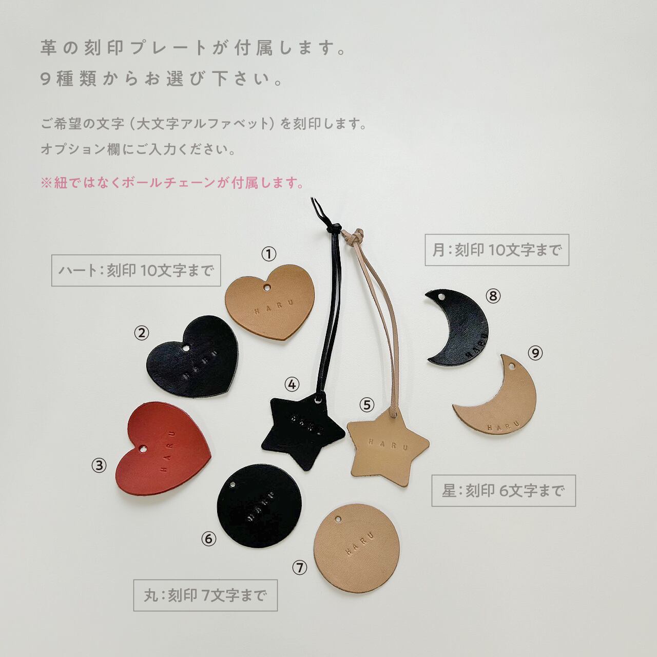 星/丸/月/ハートの全9種類から選べる革ネームプレート付き!(6~10文字の刻印ができます)